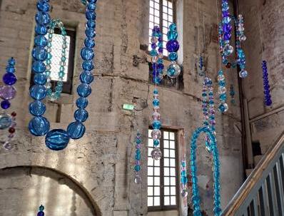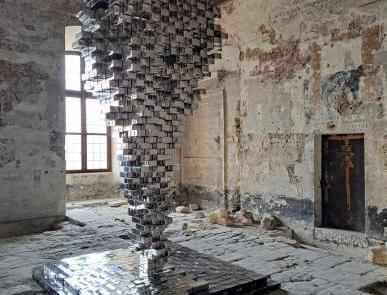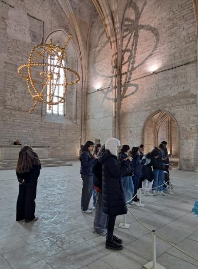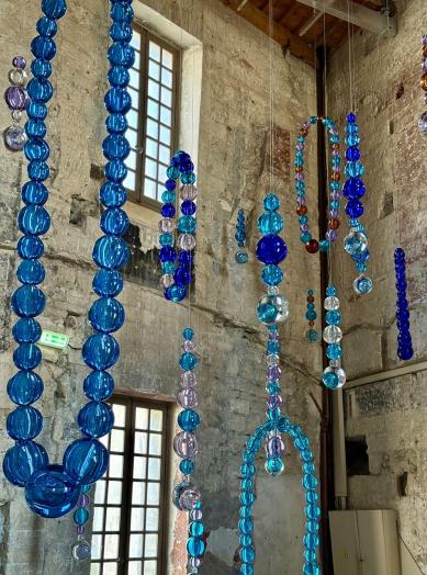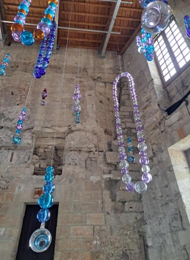 Grâce au financement du Pass Culture et du budget Arts, les lycéens ont pu découvrir des astrolabes de 10m de haut qui tournent sur elles-mêmes grâce au vent, mais qui doivent lui résister, des colliers géants qui évoquent des parures de bijoux, des constellations, sortes d’astres à base de nœuds et des rivières de verre bleu suggérant l’élément liquide alors que le matériau est solide ou encore des mobiles des figures du zodiaque. Jean-Michel OTHONIEL nous invite donc à voyager dans le merveilleux et la poésie, la préciosité et l’ornement, mais il y a également quelque chose de l’ordre du sacré et du spirituel dans ses mises en espace. Sa démarche contribue en tout cas à réenchanter le monde et nos imaginaires ce dont nous avons bien besoin de nos jours. Nommé académicien en 2018 en tant que membre de l’académie des Beaux-Arts dans la section sculpture, il répond à des commandes publiques ou privées comme en 2022 au Palais idéal du Facteur Cheval à Hauterives.