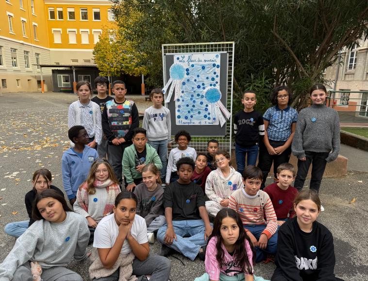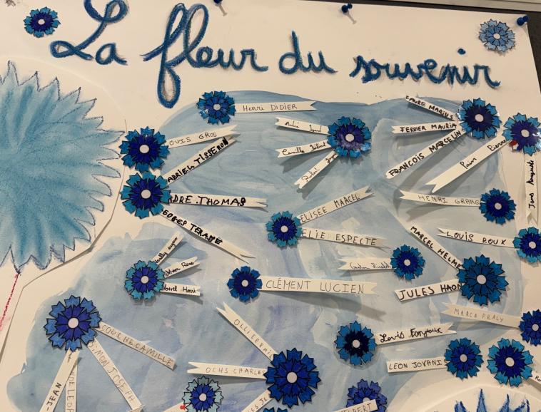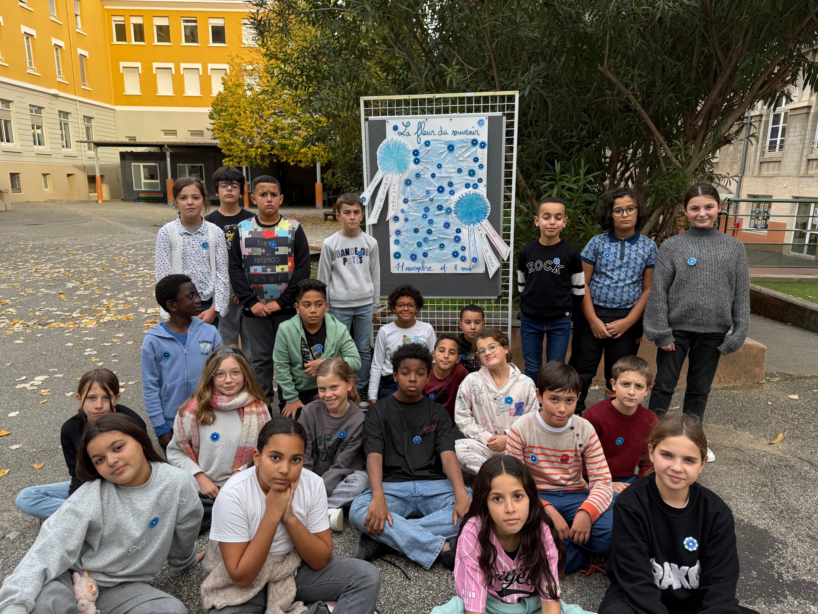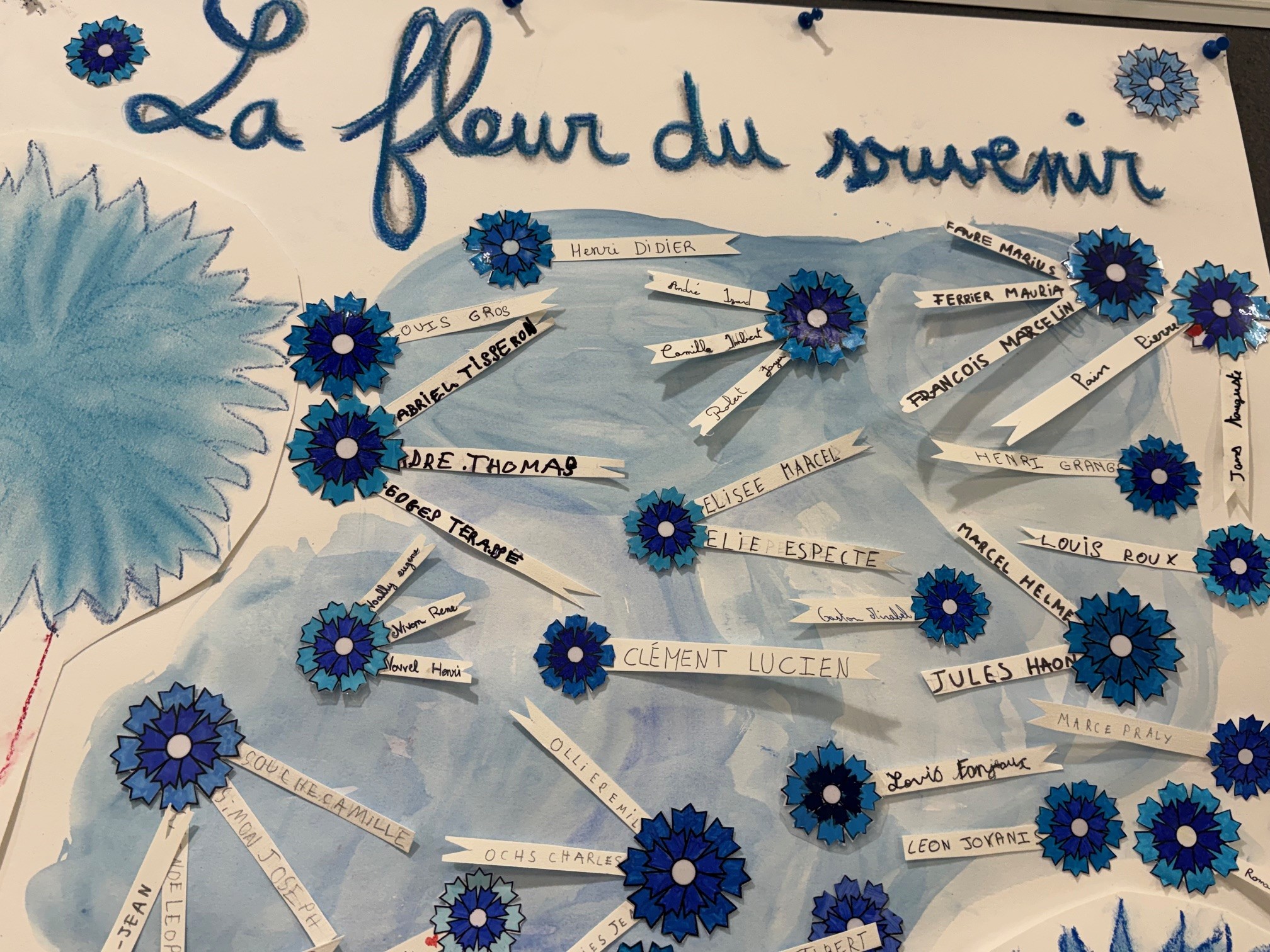 Durant la semaine du 11 novembre, les élèves de la classe ont créé une affiche sur le thème de la fleur du souvenir et ont porté sur eux cette petite fleur bleue pour honorer la mémoire des anciens combattants, des victimes de guerre et de tous ceux qui ont œuvré pour la paix.