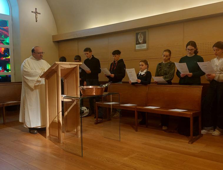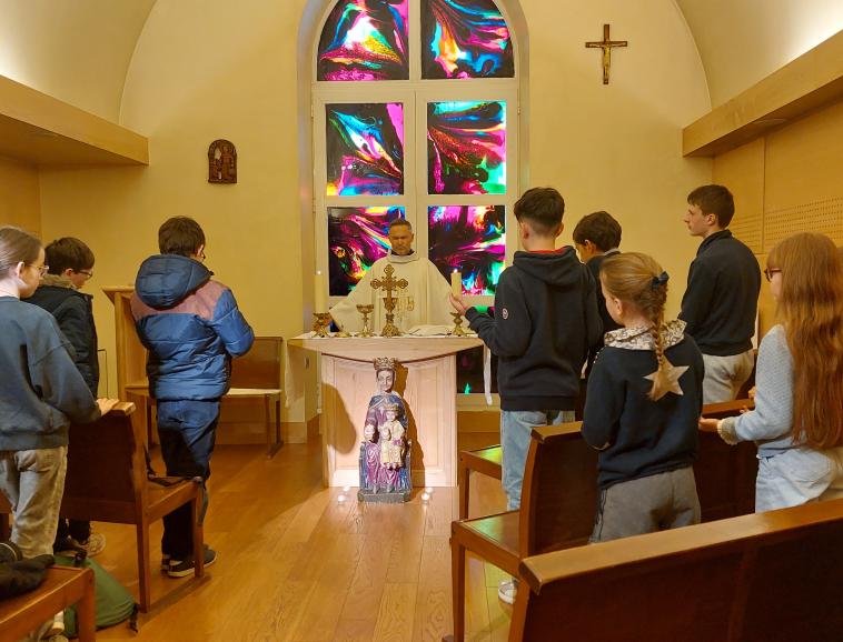 La messe de l’Annonciation avec la bénédiction des vitraux réalisés par les élèves de sixième lors de la fête de l’Institution a été un moment fort et recueilli.