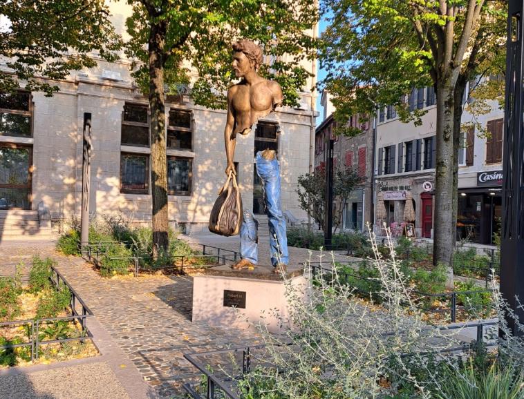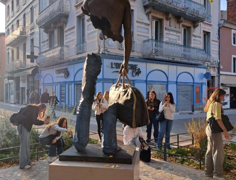 Sur le chemin, ils ont également découvert une sculpture récente de 3 mètres de haut de l’artiste contemporain habitant Crest Bruno CATALINO datée de 2025. Commandée par la ville de Valence et installée le 17 mai. Elle fait partie de la série intitulée Les voyageurs démarrée depuis 1995. Cette sculpture est caractérisée par l’absence de la partie centrale du personnage ce qui représente une prouesse technique puisqu’elle est faite autant de vide que de plein. Nous sommes ensuite tombés sur une monumentale fresque murale de 12 x 9 mètres du collectif argentin Ciclope, un duo de street artistes, venus travailler en 2023 lors du festival Wall & Love. Pour finir, ils ont pu revoir ou voir la sculpture de Jaume PLENSA créée en 2024 intitulée Le messager qui représente une figure accueillante dans laquelle il est possible de s’abriter et d’avoir un autre regard sur la place et les bâtiments qui l’entourent.