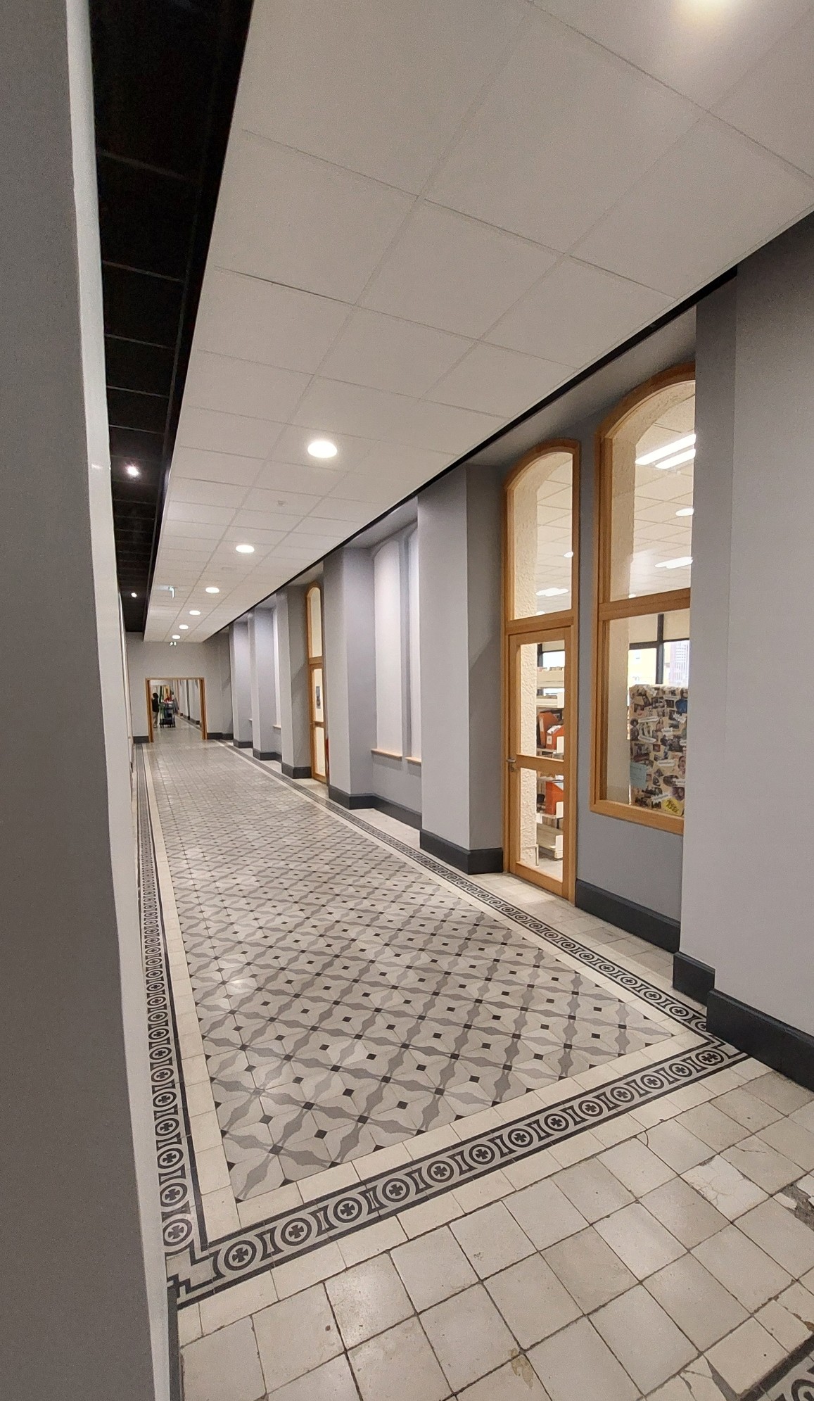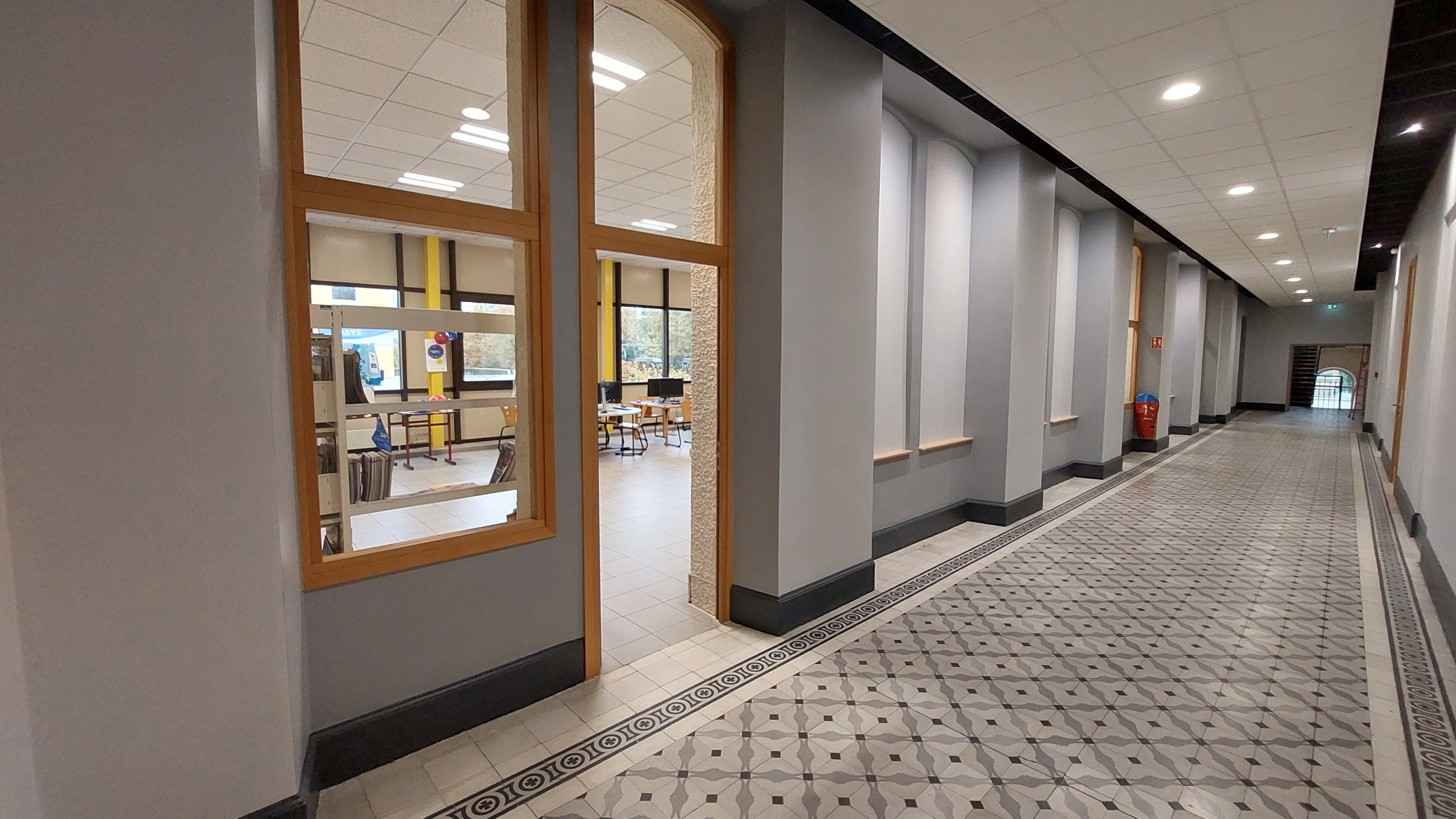 Accompagnée par la région Auvergne Rhône Alpes pour la moitié du couloir desservant le CDI du Lycée, cette rénovation a permis de répondre à la demande de mise en conformité incendie, de donner un coup de jeune tout en respectant la nature du bâtiment datant de 1920.