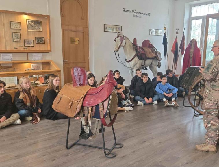 Enfin, ils ont continué leur après-midi avec la visite du musée des Spahis. Après avoir été accueillis par l’adjudant-chef Laurent Henneron , les élèves ont rencontré la mascotte du régiment puis ils ont pu connaître, grâce à au dynamisme du conservateur adjoint du musée, l’histoire des cipayes, mercenaires dans l’empire ottoman, devenus les Spahis par décret du 10 septembre 1834.