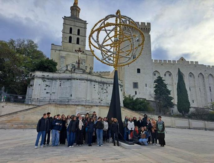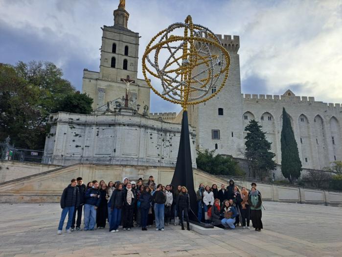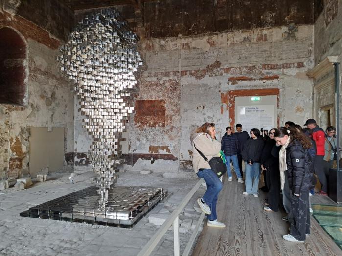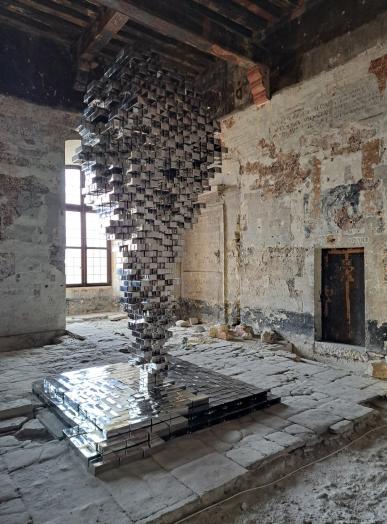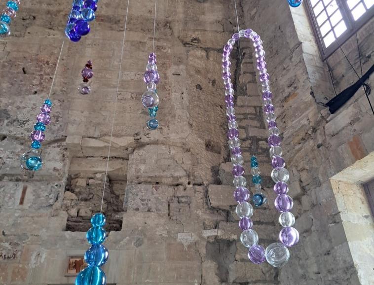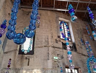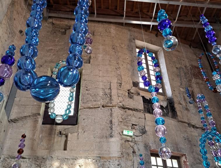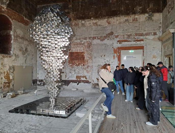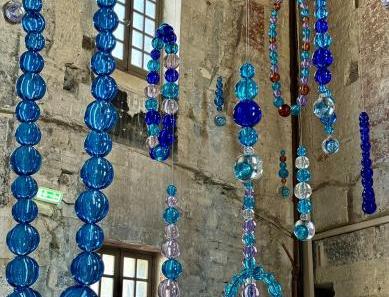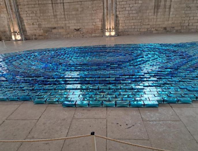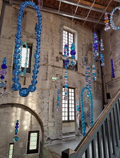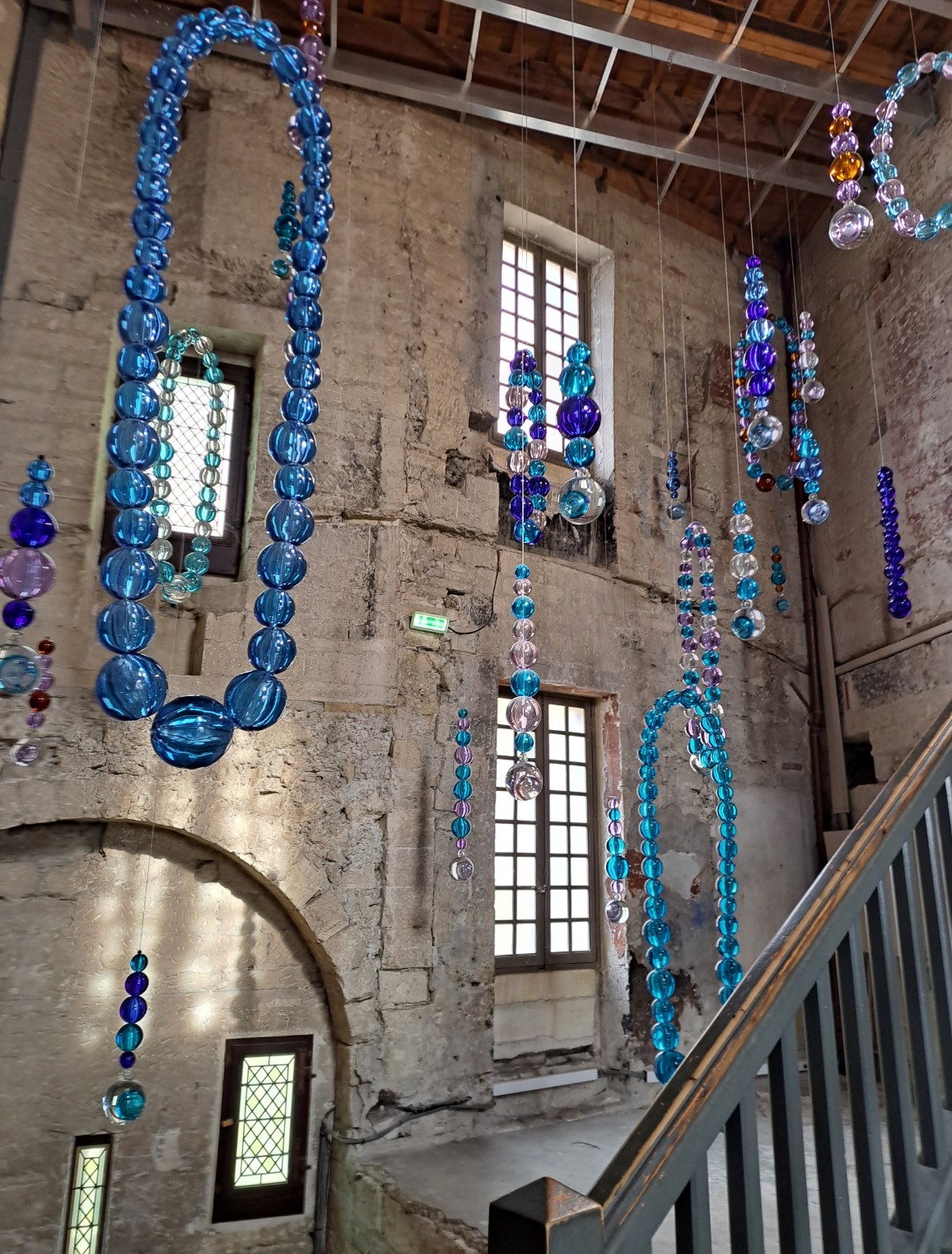 Grâce au financement du Pass Culture et du budget Arts, les lycéens ont pu découvrir des astrolabes de 10m de haut qui tournent sur elles-mêmes grâce au vent, mais qui doivent lui résister, des colliers géants qui évoquent des parures de bijoux, des constellations, sortes d’astres à base de nœuds et des rivières de verre bleu suggérant l’élément liquide alors que le matériau est solide ou encore des mobiles des figures du zodiaque. Jean-Michel OTHONIEL nous invite donc à voyager dans le merveilleux et la poésie, la préciosité et l’ornement, mais il y a également quelque chose de l’ordre du sacré et du spirituel dans ses mises en espace. Sa démarche contribue en tout cas à réenchanter le monde et nos imaginaires ce dont nous avons bien besoin de nos jours. Nommé académicien en 2018 en tant que membre de l’académie des Beaux-Arts dans la section sculpture, il répond à des commandes publiques ou privées comme en 2022 au Palais idéal du Facteur Cheval à Hauterives.