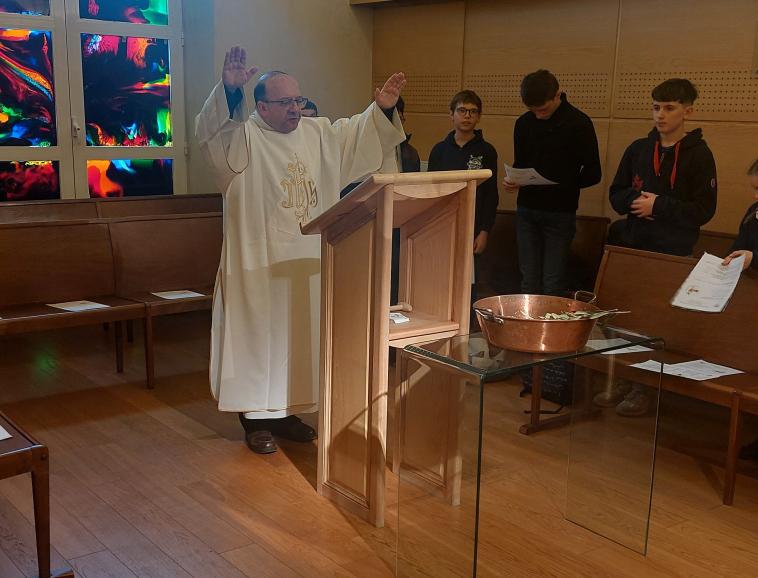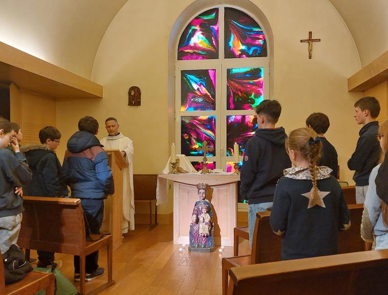 La messe de l’Annonciation avec la bénédiction des vitraux réalisés par les élèves de sixième lors de la fête de l’Institution a été un moment fort et recueilli.
