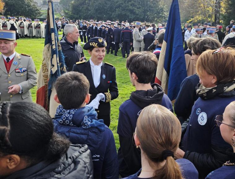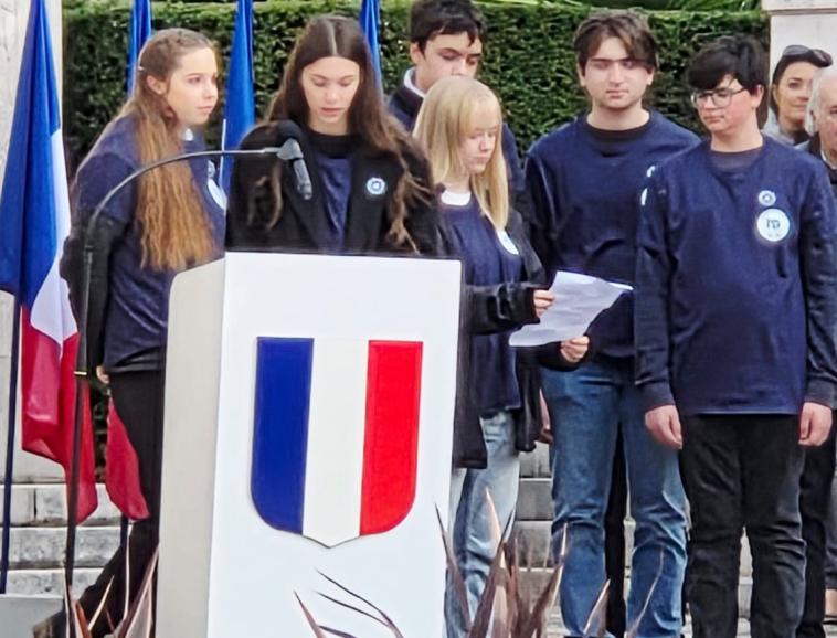 Sous les yeux d’Inès, porte-drapeau pour la Société des Membres de la Légion d’Honneur (SMLH), Marjane et Léna ont lu les paroles de la chanson du bleuet de France composées par Jean-Jacques Goldman à l’occasion du centenaire du bleuet et dont le refrain a été lu par Mélisse, Achille, Liam et Clément. Les autres étaient dans le carré réservé à la jeunesse derrière Gabriel portant fièrement le drapeau en hommage aux héros de Verdun, morts pour la France en 1916.