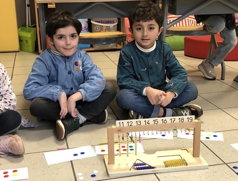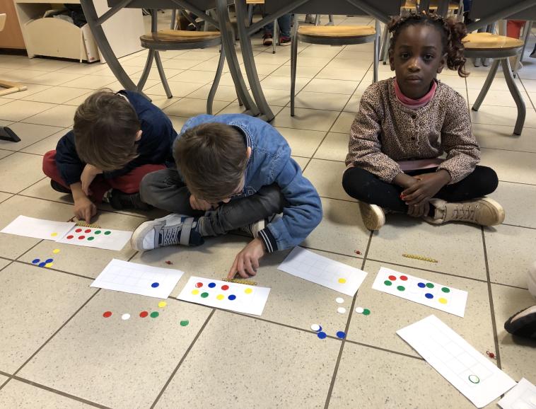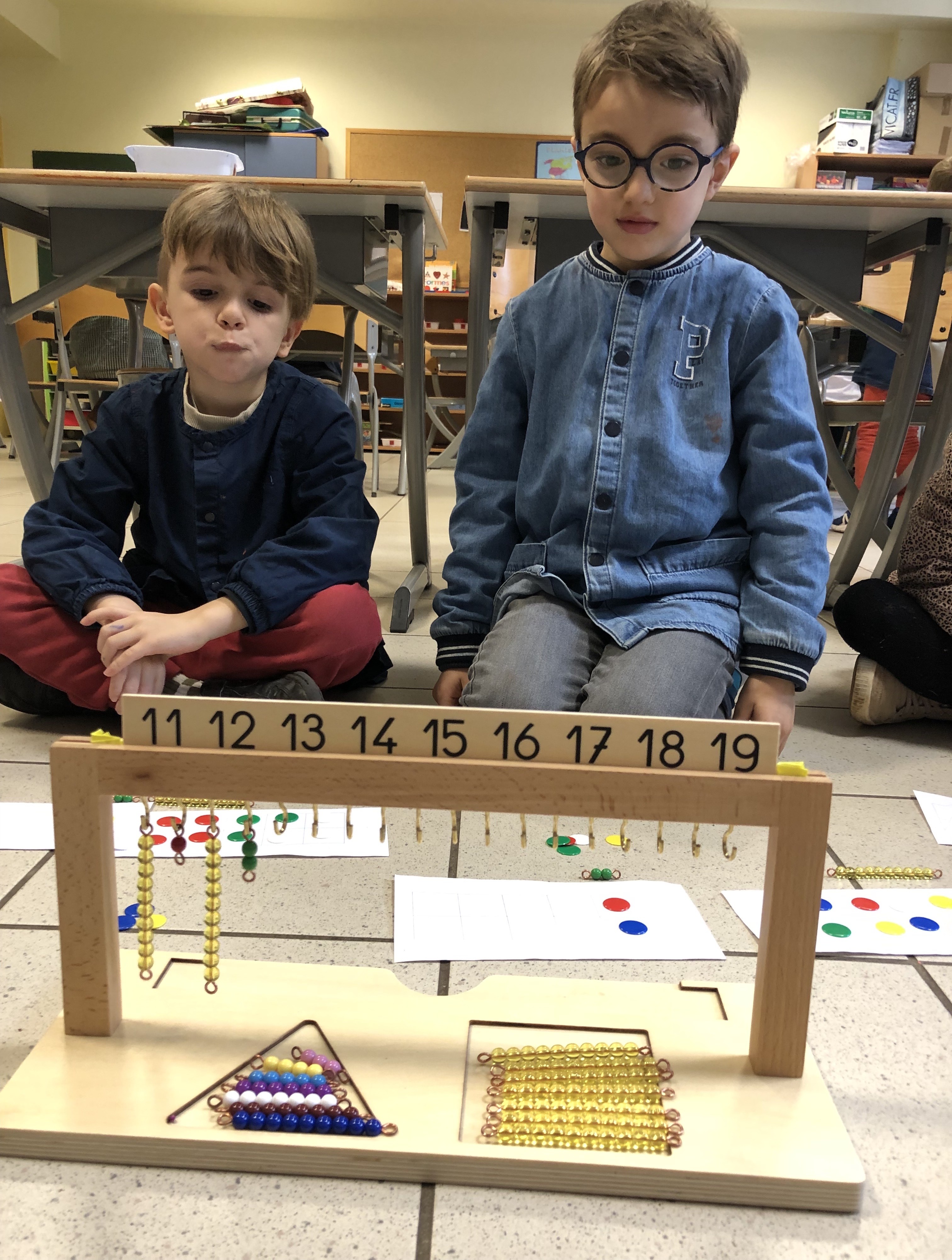 Dans notre classe de grande section, les élèves ont suivi une séance sur la manipulation en numérotation avec du matériel Montessori. Au programme : la construction des nombres au-delà de 10.