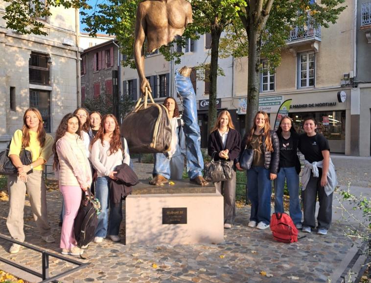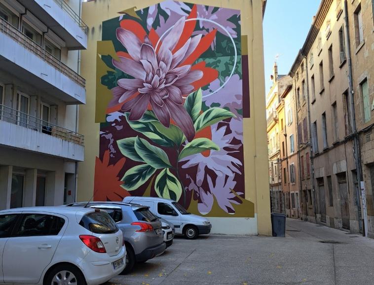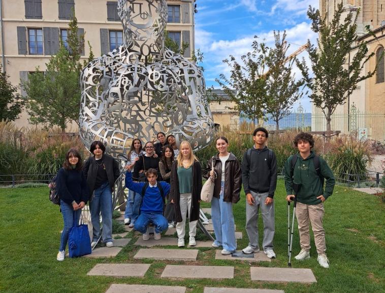 Sur le chemin, ils ont également découvert une sculpture récente de 3 mètres de haut de l’artiste contemporain habitant Crest Bruno CATALINO datée de 2025. Commandée par la ville de Valence et installée le 17 mai. Elle fait partie de la série intitulée Les voyageurs démarrée depuis 1995. Cette sculpture est caractérisée par l’absence de la partie centrale du personnage ce qui représente une prouesse technique puisqu’elle est faite autant de vide que de plein. Nous sommes ensuite tombés sur une monumentale fresque murale de 12 x 9 mètres du collectif argentin Ciclope, un duo de street artistes, venus travailler en 2023 lors du festival Wall & Love. Pour finir, ils ont pu revoir ou voir la sculpture de Jaume PLENSA créée en 2024 intitulée Le messager qui représente une figure accueillante dans laquelle il est possible de s’abriter et d’avoir un autre regard sur la place et les bâtiments qui l’entourent.