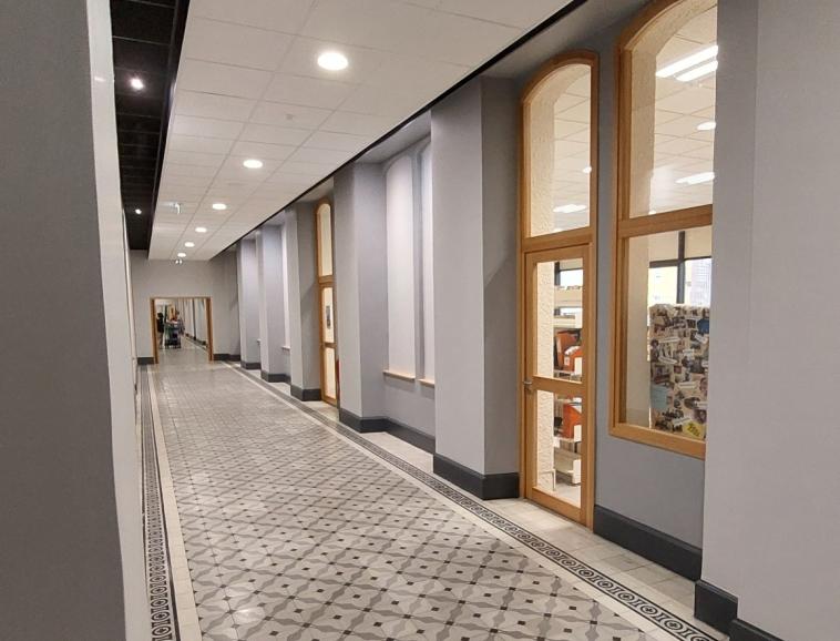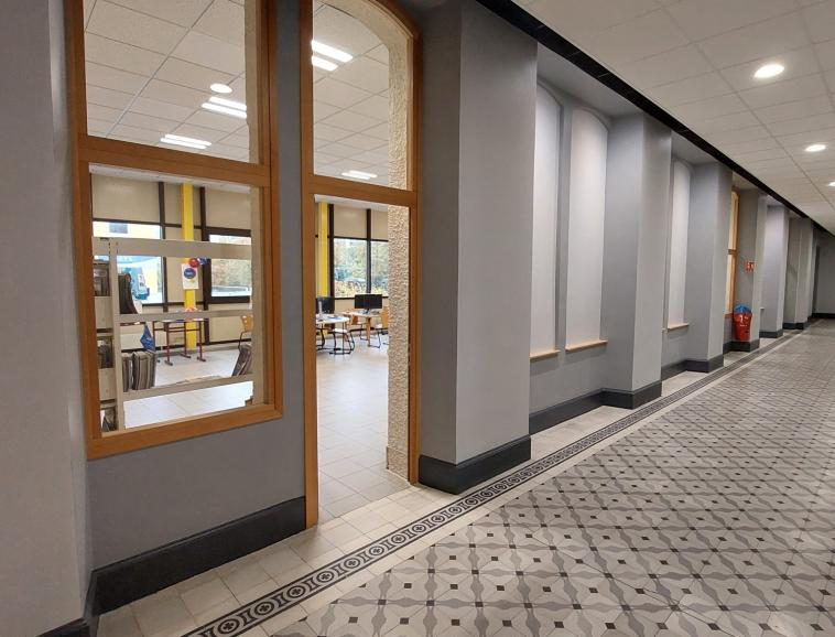 Accompagnée par la région Auvergne Rhône Alpes pour la moitié du couloir desservant le CDI du Lycée, cette rénovation a permis de répondre à la demande de mise en conformité incendie, de donner un coup de jeune tout en respectant la nature du bâtiment datant de 1920.