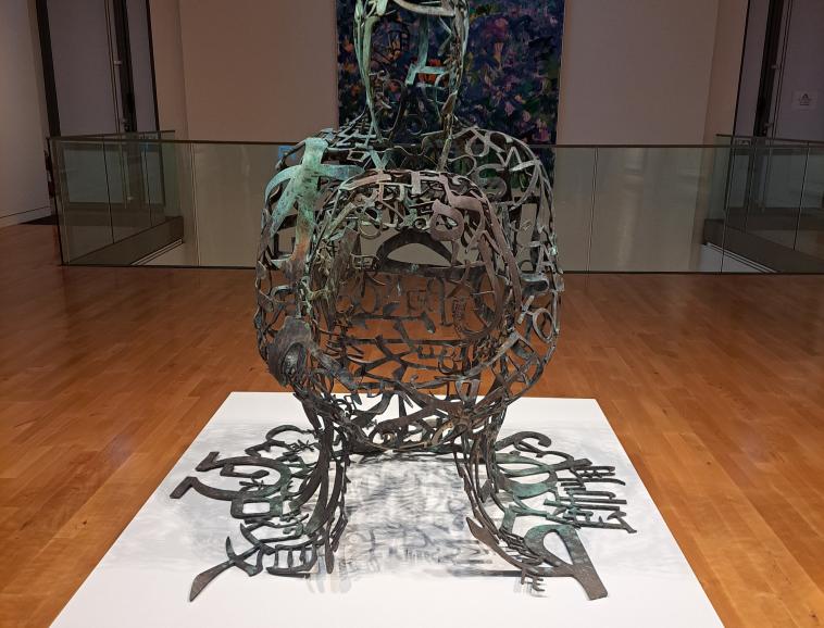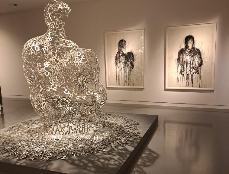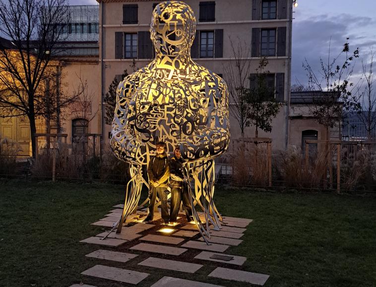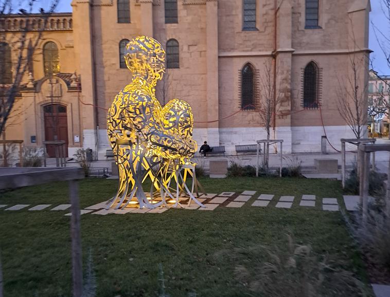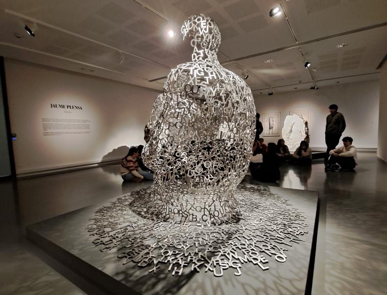 Né en 1955 à Barcelone, donc artiste méditerranéen, Jaume PLENSA avait déjà été invité à Valence en 1994 pour une biennale intitulée "Un sculpteur, une ville". Il avait alors réalisé 21 portes en bronze disséminées dans la ville. Cela tombait évidemment sous le sens qu'il réponde présent et intervienne à nouveau légitimement trente ans plus tard. Mais cette fois, il répond à une commande spécifique de la ville de Valence avec une sculpture en acier inoxydable de près de 5 mètres de haut et de 1.5 millions d’euros. Intitulée Le messager, sa statue installée place des Ormeaux correspond à une sculpture en dentelle de neuf alphabets qui se mélangent entre eux. Elle figure un corps anthropomorphe, une silhouette ouverte faite de pleins et de vides, de lettres entrelacées et soudées les unes aux autres pour former une résille aérienne et diaphane qui semble en lévitation et qui accueille le spectateur. Ce dernier peut effectivement s’immerger dedans comme dans un abri accueillant et protecteur.