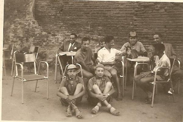 Nous venons d’arriver à Rome. Le père Ferrier et Jacques Perrier sont partis reconnaitre le collège Mariste où nous devons loger. Nous les attendons en terrasse d’un petit café aux pieds des remparts de Rome, Porte Pia. Le propriétaire du café a sorti son petit singe (sur la table) en notre honneur.