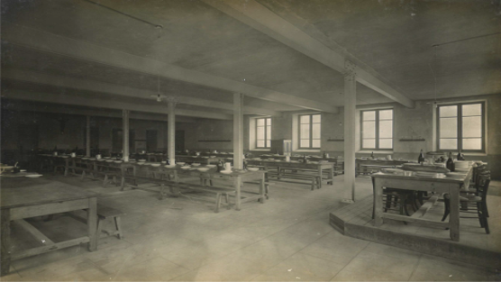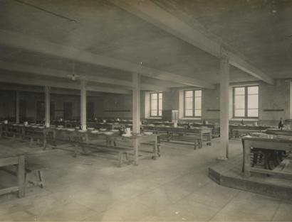 Sur la gauche, un escalier caché permet d’accéder aux sous-sols où on trouvait les douches utilisées par les internes le samedi en soirée, la chaufferie, les ateliers du personnel d’entretien, les trois réfectoires, des professeurs, de la 1ere division et de la 2eme division où nous n’étions autorisés à parler qu’après le bénédicité. C’est pendant le repas de midi qu’on nous distribuait le courrier qui avait été ouvert et censuré par le supérieur. De même, lorsque nous écrivions à quelqu’un, la lettre devait être déposée ouverte dans une boite spéciale où le supérieur venait les chercher et lisait notre correspondance en la censurant éventuellement avant de la poster. Inutile de préciser qu’en dehors de la famille directe aucune autre lettre ne passait la censure. Heureusement nos camarades externes, pouvaient nous dépanner dans certains cas, mais il ne fallait pas se faire prendre, sous peine de renvoi. Au-delà des réfectoires, c’était les cuisines et réserves, royaume de Carmella, une « mama » italienne qui avait son franc parler. Son mari, Giovani aidait pour le service, mais comme nous l’avions vu dans la matinée ramasser les feuilles ou nettoyer à grand jet les cabinets dans la cour, nous nous demandions toujours s’il s’était lavé les mains. Madame Benistant et son mari participaient également au service.