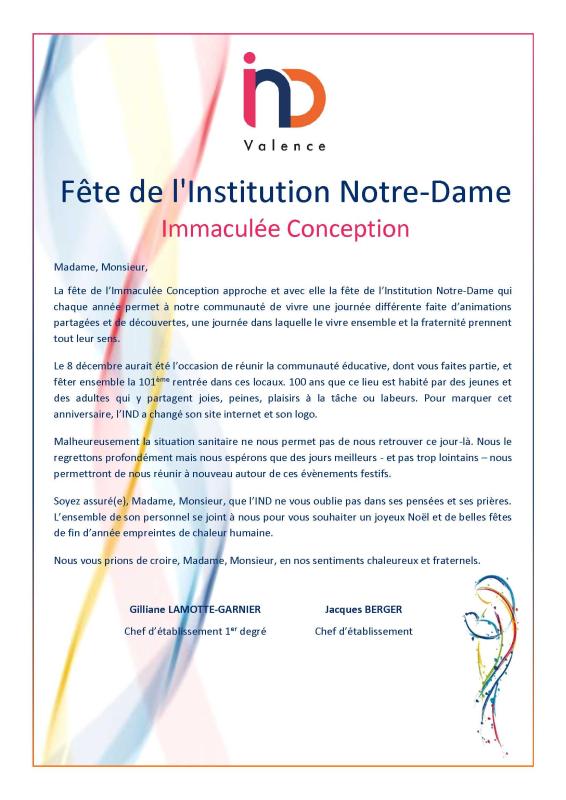 « On oublie, hélas, plus vite les moments heureux et paisibles ! Par bonheur nous avons les annales de l’IND, des mémoires vivantes, des repères annuels, même si aujourd’hui les dates de nos rencontres sont devenues mobiles ! Les 101 deviendront 101 ans (davantage ne le souhaitons pas pour nous !). Et puis Noël est une date fixe, et un rendez-vous important pour beaucoup, même non chrétiens, voire ignorants du sens de cette fête. Alors gardons l’espérance, chassons autant que faire se peut les visions sombres ou pessimistes ! Il est vrai que ceux qui ont aujourd’hui l’âge que nous avions quand nous allions quitter l’IND vivent un temps d’incertitude, que la mise en place du “Parcoursup” n’est pas fait pour rendre plus serein, mais enfin, ils sont jeunes ! Ne les désespérons pas par des réflexions maussades ou désabusées ! ».