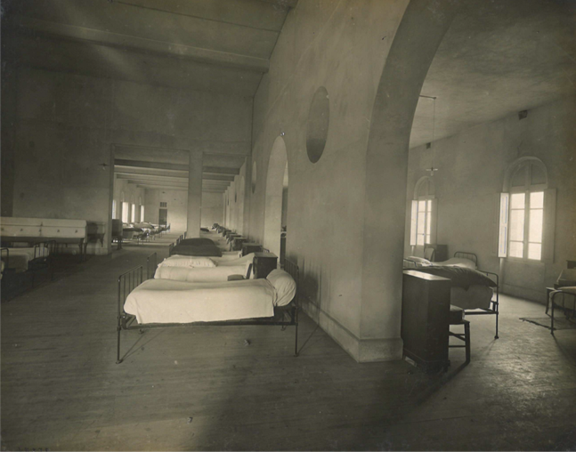 En montant l’escalier jusqu’au 2eme étage, nous arrivions aux dortoirs, précédés du hall dans lequel des rangées de casiers à chaussures nous permettaient d’entrer dans les dortoirs en pantoufles. Ces dortoirs étaient quittés le matin à 6h30 fenêtres ouvertes et lits ouverts. Nous y remontions à midi pour faire nos lits et fermer les fenêtres. Ils n’étaient pas chauffés. Je me souviens de février 56 durant lequel il fit très froid (-15° à -20° pendant 3 semaines). Le matin au réveil, nos gants de toilette étaient gelés et très vite, seul le dortoir des terminales resta utilisable pour la toilette, tous les autres lavabos étaient inutilisables pour cause de gel. En face de l’escalier, le dortoir de la 2eme division, grand dortoir d’une centaine de lits qui occupait toute l’aile droite. Sur la gauche, le dortoir des terminales qui occupait un tiers du bâtiment central et à gauche au milieu du couloir le dortoir de la 1ere division, abritant une cinquantaine de lits qui occupait le reste de l’étage. Dans chaque dortoir, une ou deux rangées de lavabos (auge en zinc dans laquelle un certain nombre de jets coulaient pendant le temps de la toilette).